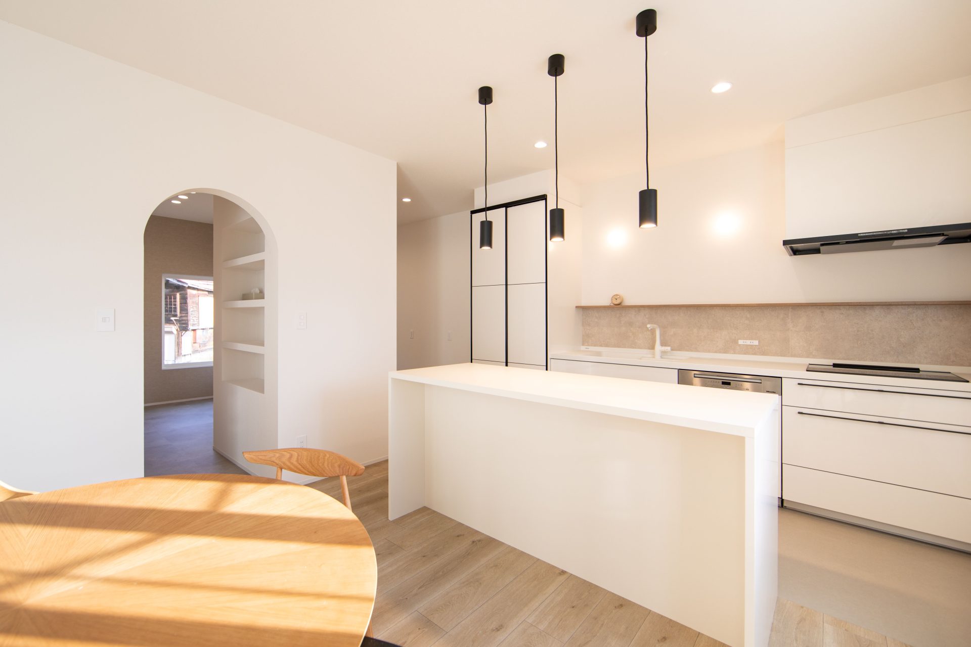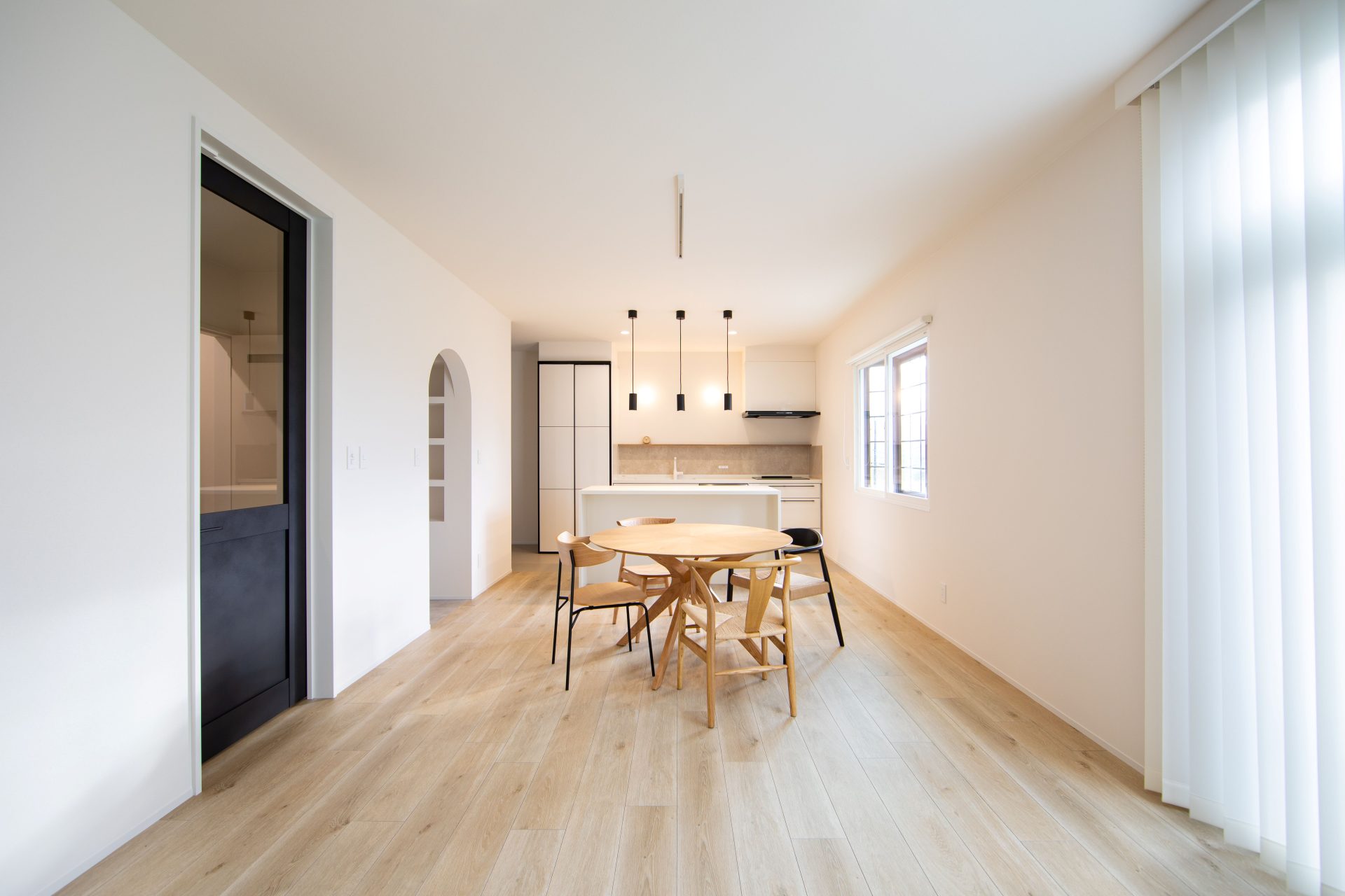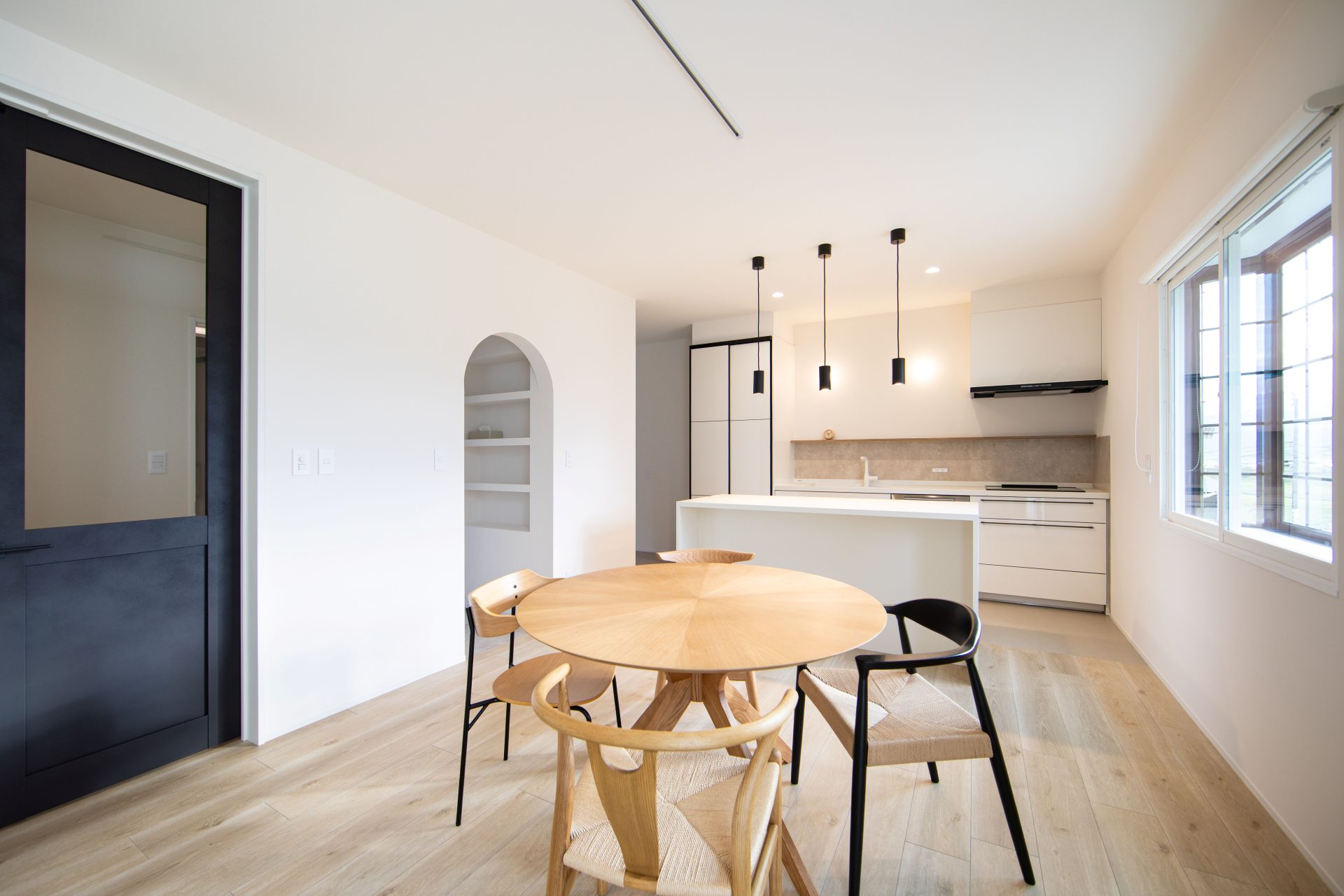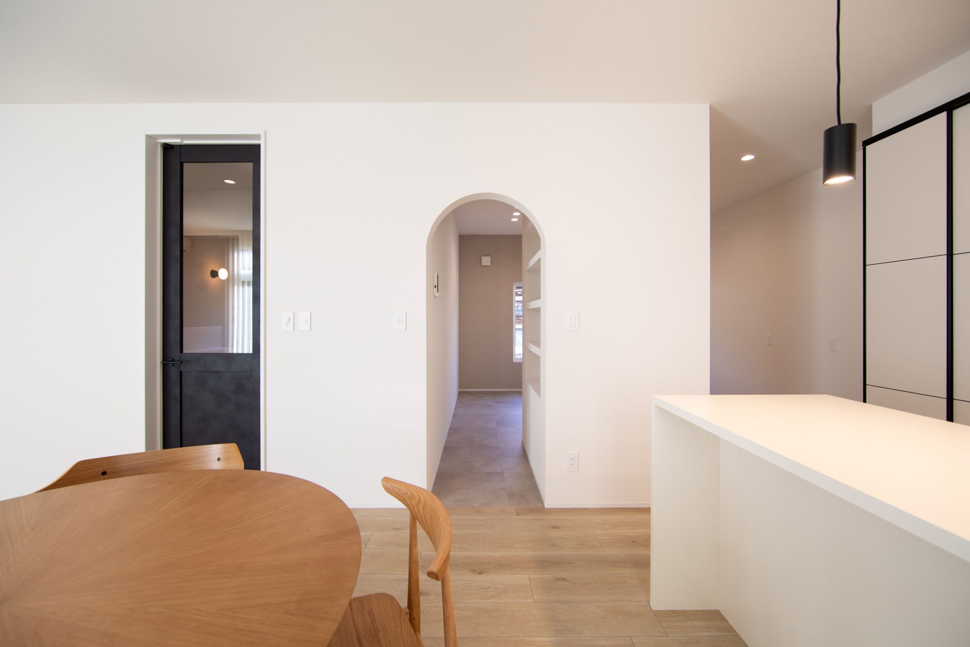 白い壁に映える黒の建具や、遊び心のあるアーチ壁が、日々の暮らしに彩りを添えます。