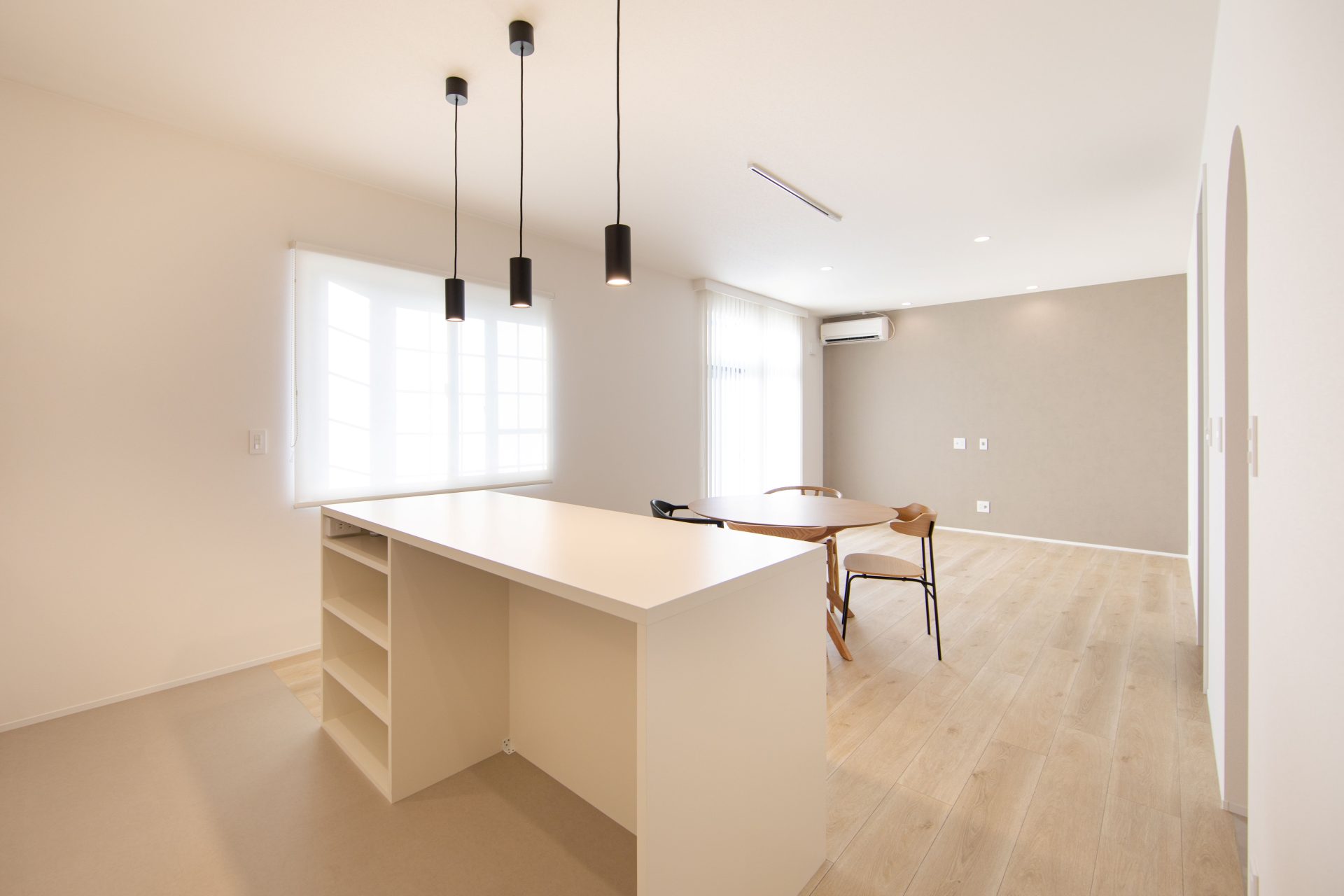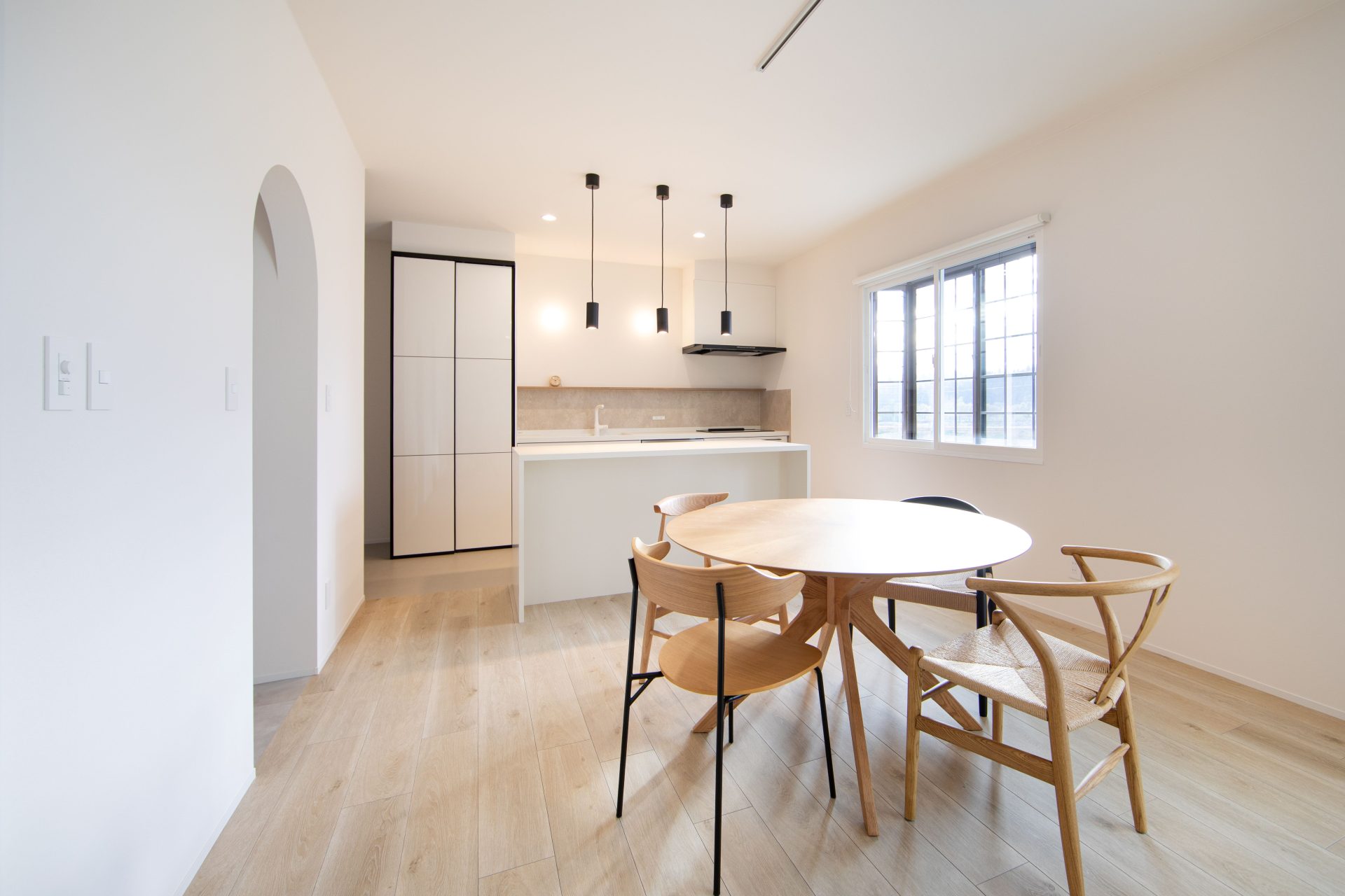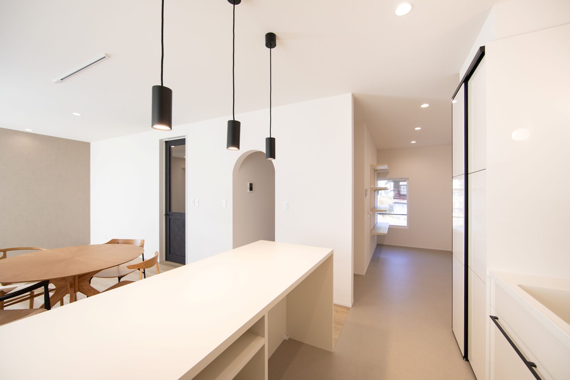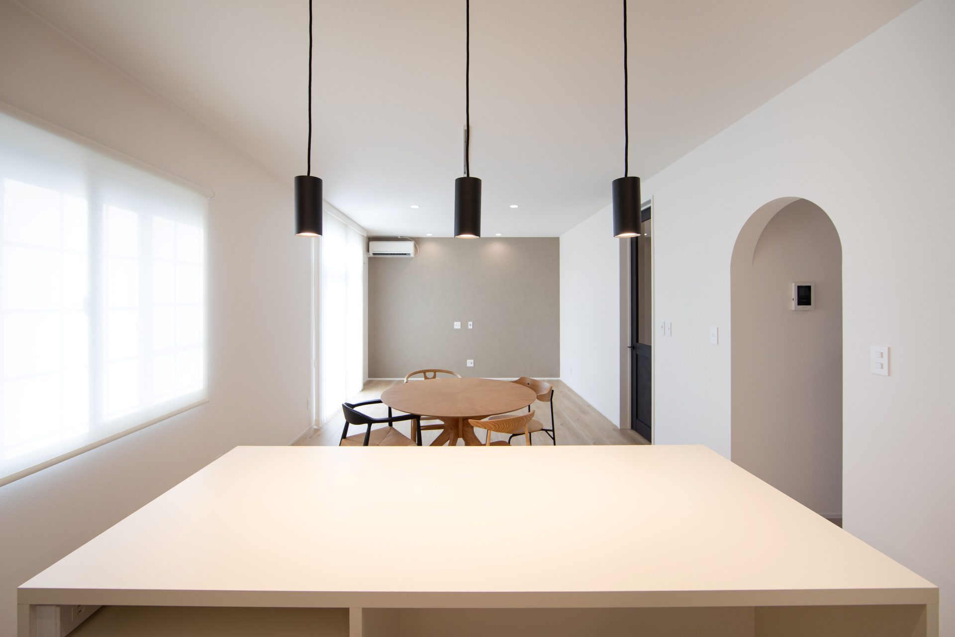 白い壁に映える黒の建具や、遊び心のあるアーチ壁が、日々の暮らしに彩りを添えます。