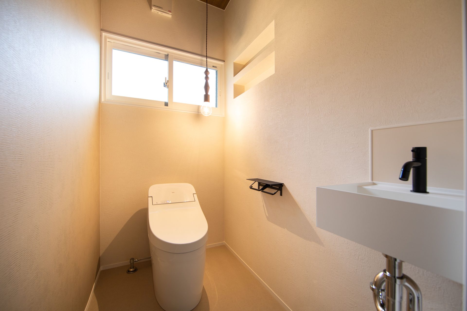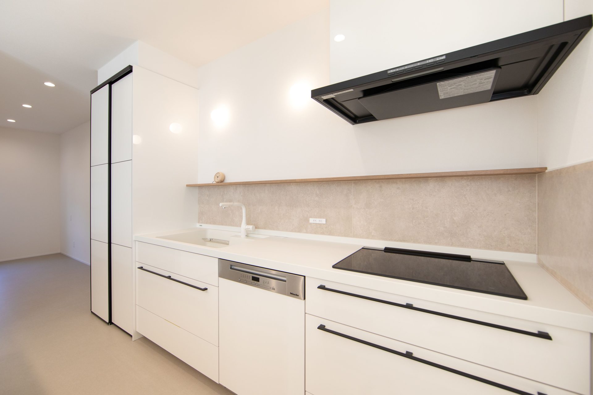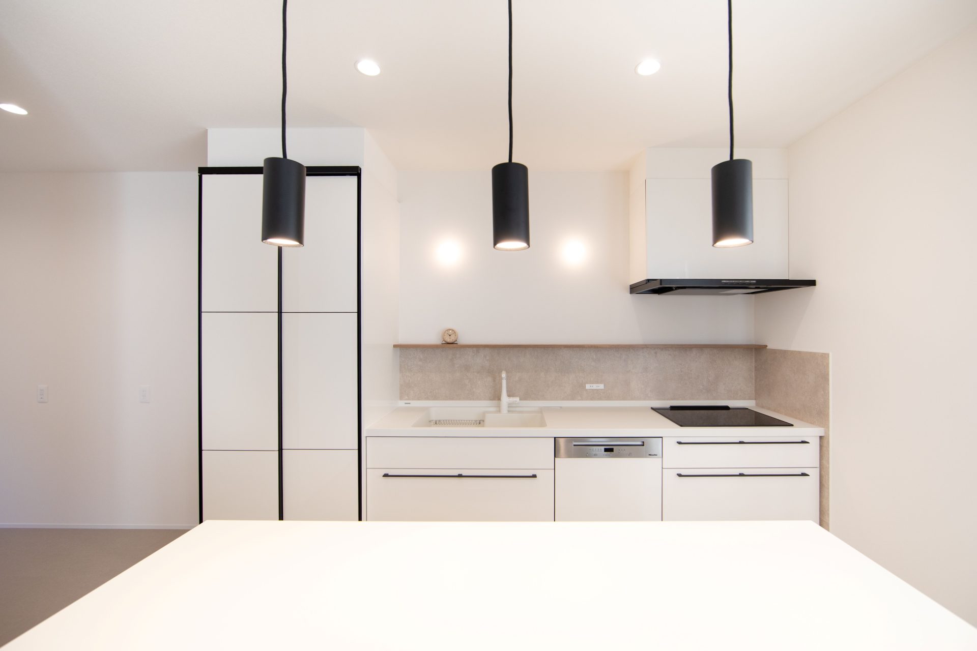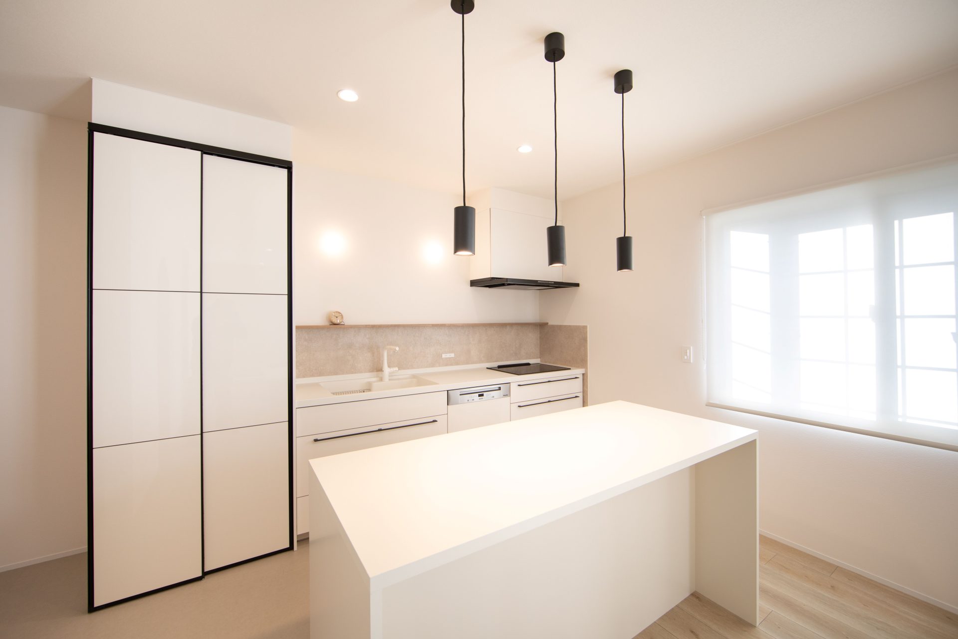 白い壁に映える黒の建具や、遊び心のあるアーチ壁が、日々の暮らしに彩りを添えます。