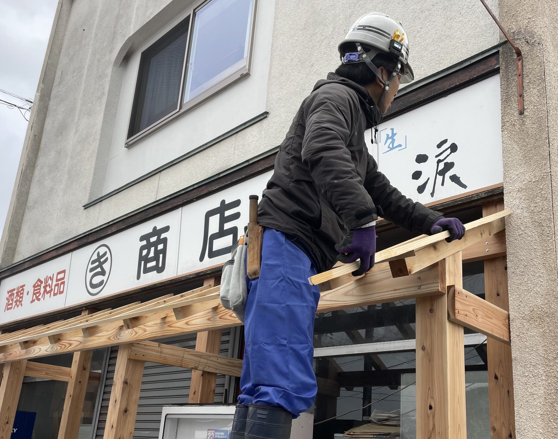 少し前の、まだ雪が積もっていない頃に、とある店舗の入り口部分の風除室屋根工事を行いました。